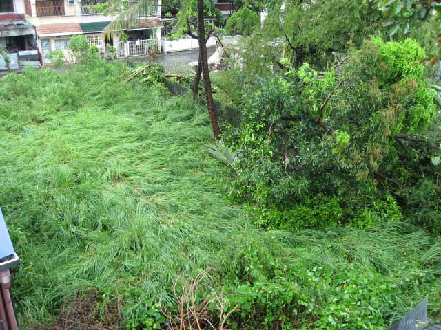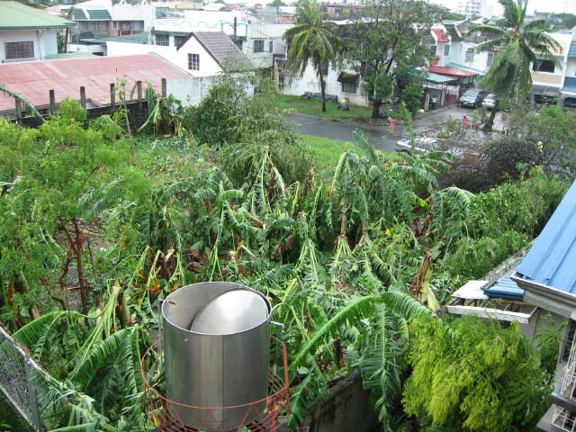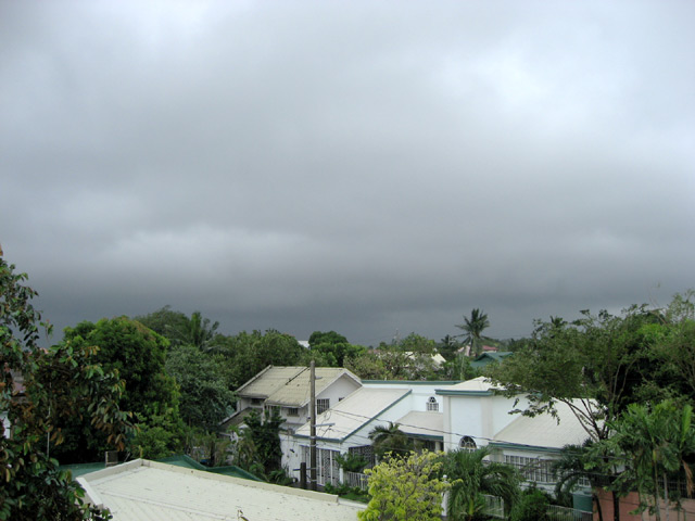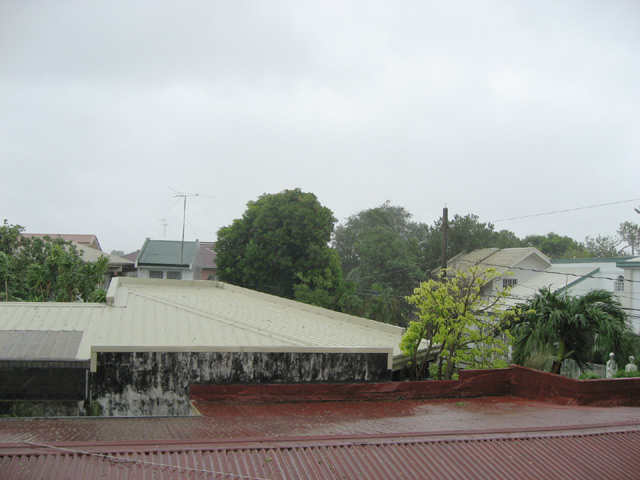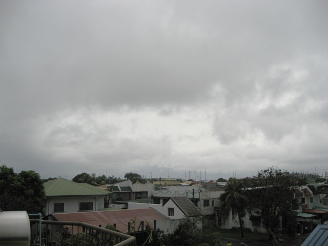 Since the center of the storm passed through southern Laguna and northern Cavite, we were in the path of the eye of the storm. The winds died down from around 11:30 until 1 in the afternoon. During the lull, I took some pictures of the storm clouds and the initial destruction (see below). It was an awesome (as in awe-inspiring) experience to watch the power of Mother Nature and observe the clouds roll up above during the quiet. I can’t remember the last time the eye of a typhoon passed but it’s definitely a mildly interesting thing to see. Central and northern Metro Manila didn’t get to see the eye and instead were subjected to hours-long torrential winds and rain.