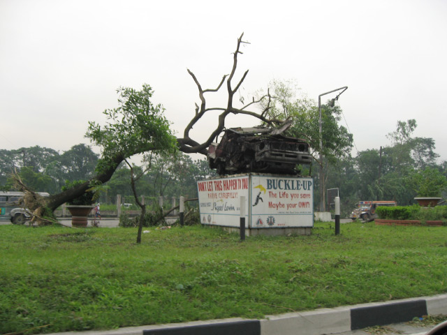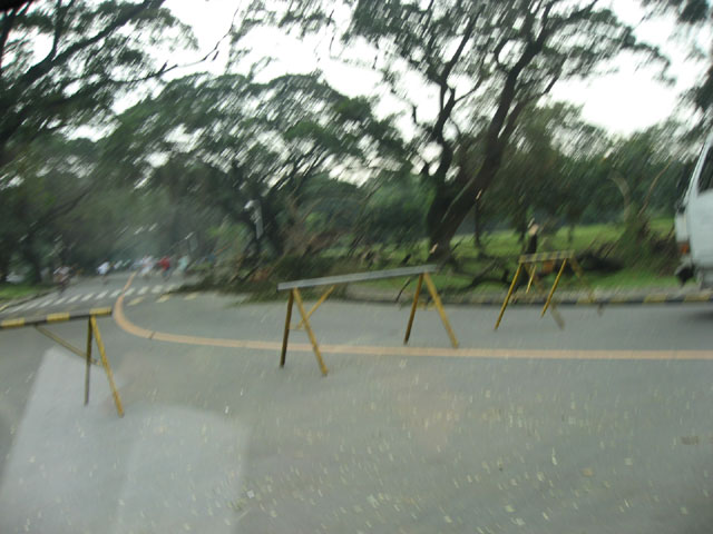 Saturday, I had to bring my younger sister to UP Diliman because she had a scheduled exam, and she wasn’t sure if it would push through or not. This time I brought my camera and we pictured the destruction along the way. I know the typhoon isn’t really a funny thing, but I can’t help but laugh at the sight of a car accident warning (the one where you have the remains of a car put up on a pedestal) on Commonwealth Ave. with a fallen tree on top of it. The pedestal admonishes: “Don’t let this happen to you!” Yes, I’ll try not to let a tree fall on top of me. (See the picture below.)