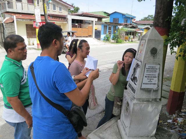 L-R, T-B: 1. The Betis Team going around Barangay San Nicolas 2nd. 2. Mappers taking notes beside a Death March trail memorial marker. 3. The Betis Team consolidating their notes after the field survey. 4. During the field survey, we saw Randy David’s ancestral home. 5. The facade of the famous Betis Church, also known as the Santiago de Apostol Parish. 6. Betis Church is famous for its ceiling art, and is often dubbed as the Sistine Chapel of the Philippines. 7. A basic paper map of Barangay San Nicolas 2nd. 8. An official of the Guagua municipal government addressing the training participants. 9. Guagua Councilor Joan Carreon holding up a tarpaulin map of Guagua depicting the data already mapped by the participants .